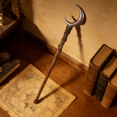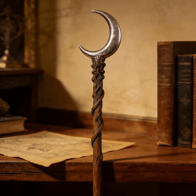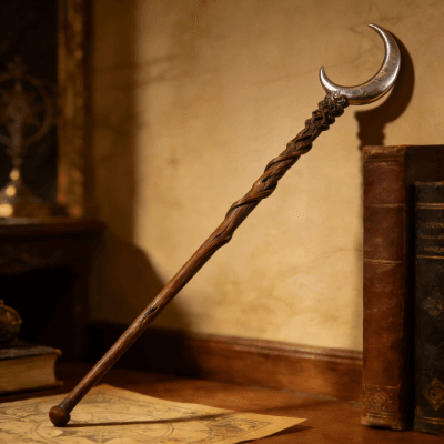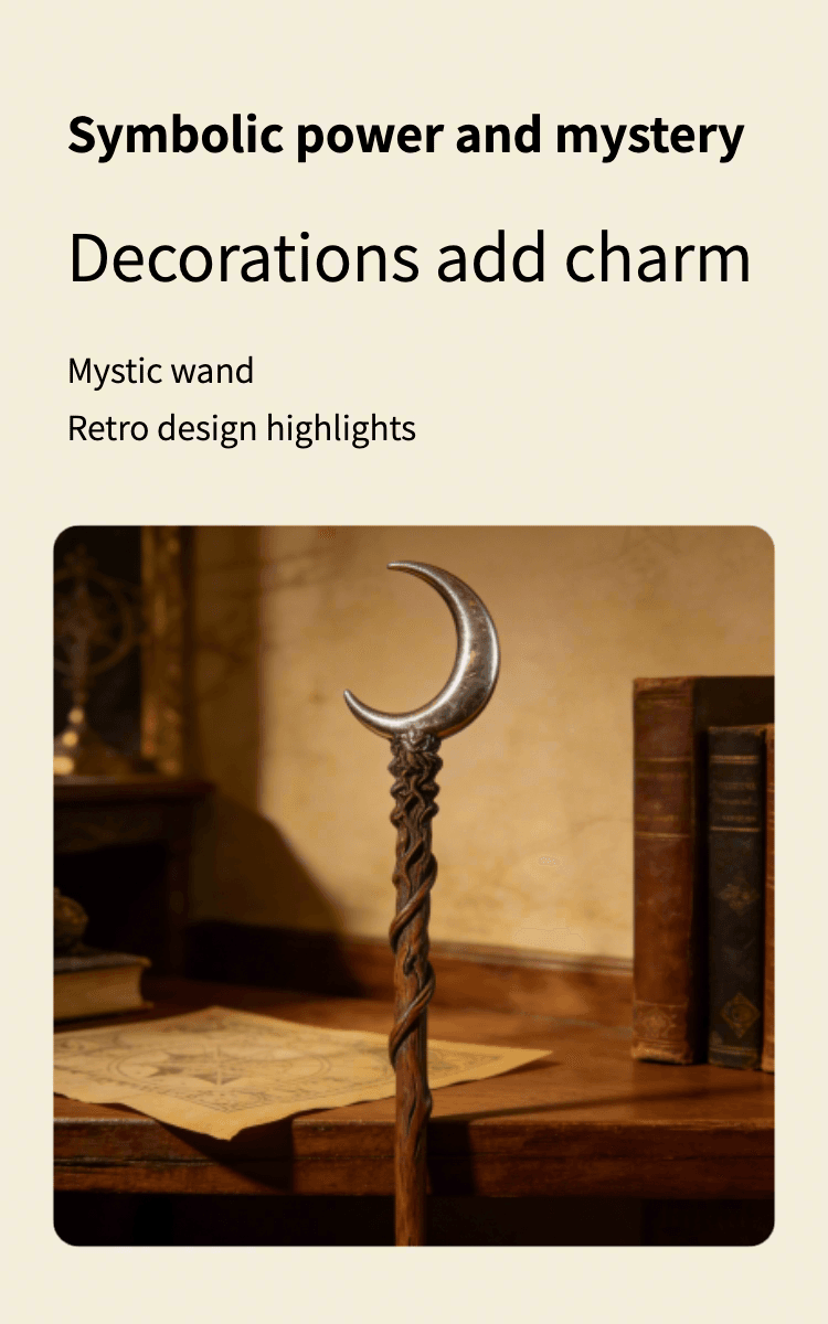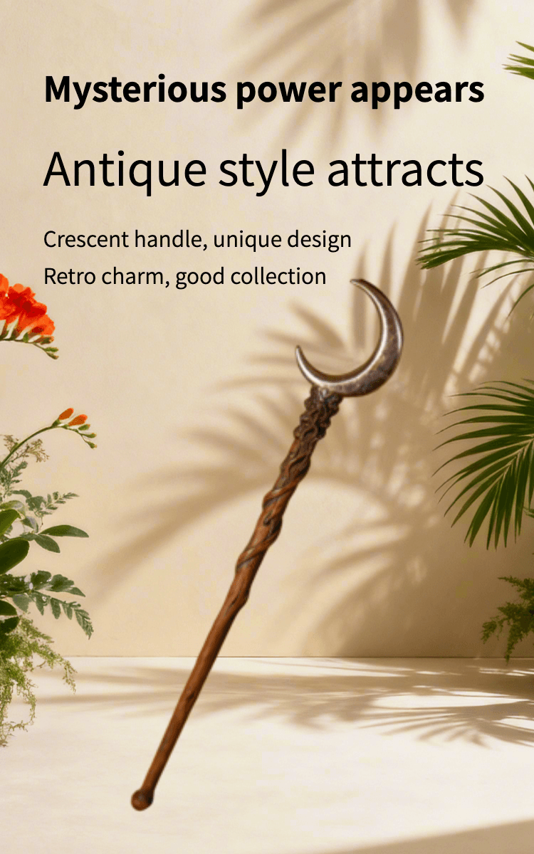 This is a handmade artisan magic wand crafted with care: the handle features intricate twisted wooden carving, paired with a polished silver crescent moon topper for a mystical look. Made from high-quality wood and durable metal, it’s designed for witchcraft/cosplay enthusiasts, fantasy fans, or collection lovers. Each piece is uniquely crafted to ensure fine detail and a premium feel—perfect as a gift or personal prop for role-playing, themed events, or display.
