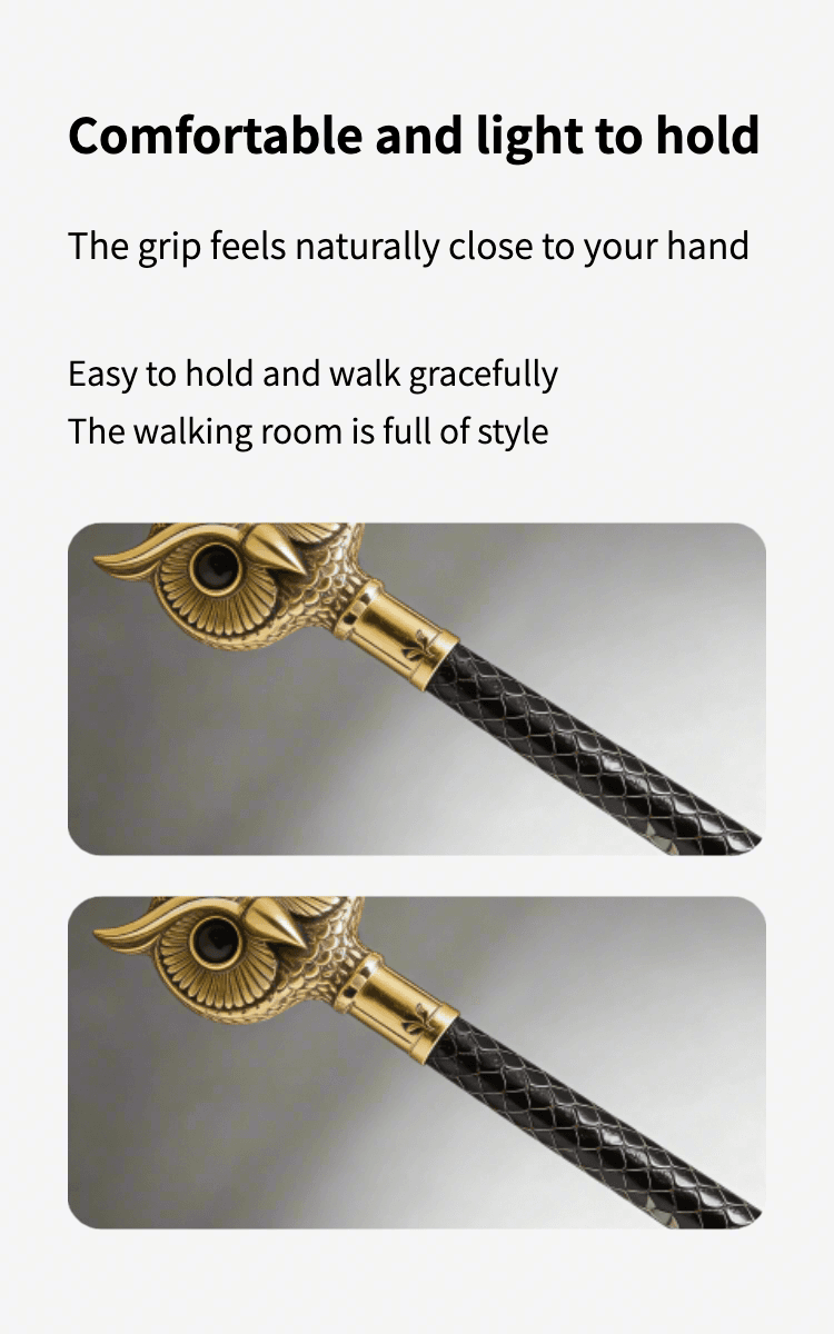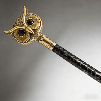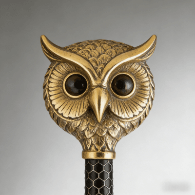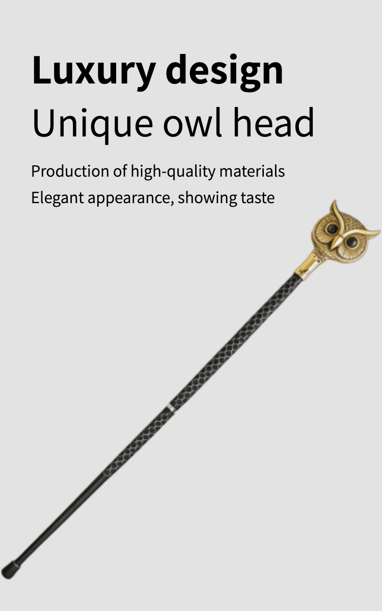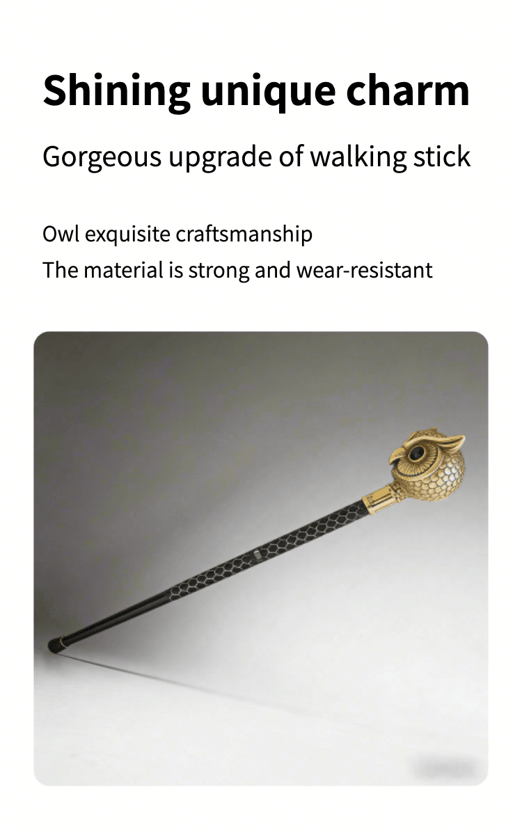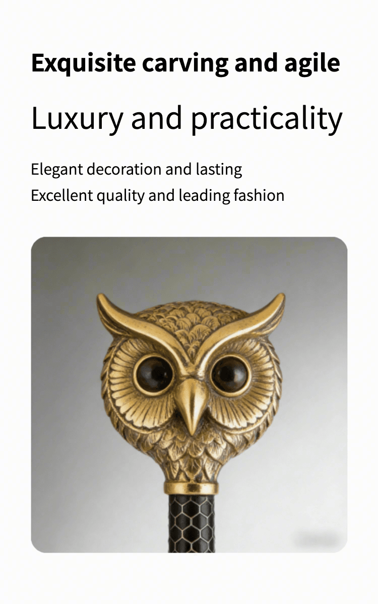 This handcrafted owl head walking cane is a stunning blend of artistry and functionality. Meticulously made by skilled artisans, it features a detailed brass owl head top (symbolizing wisdom) paired with a sleek black shaft adorned with an intricate hexagon pattern — adding vintage charm and tactile grip.