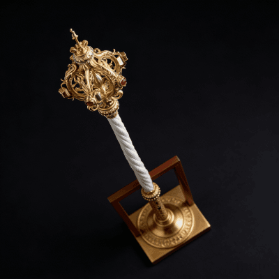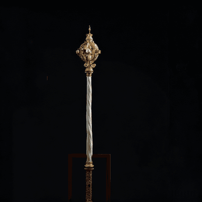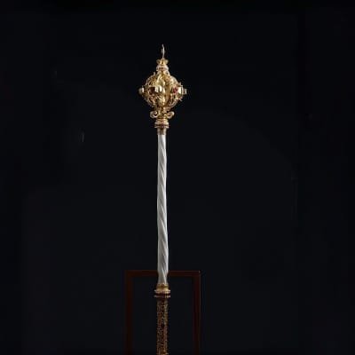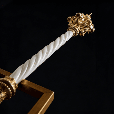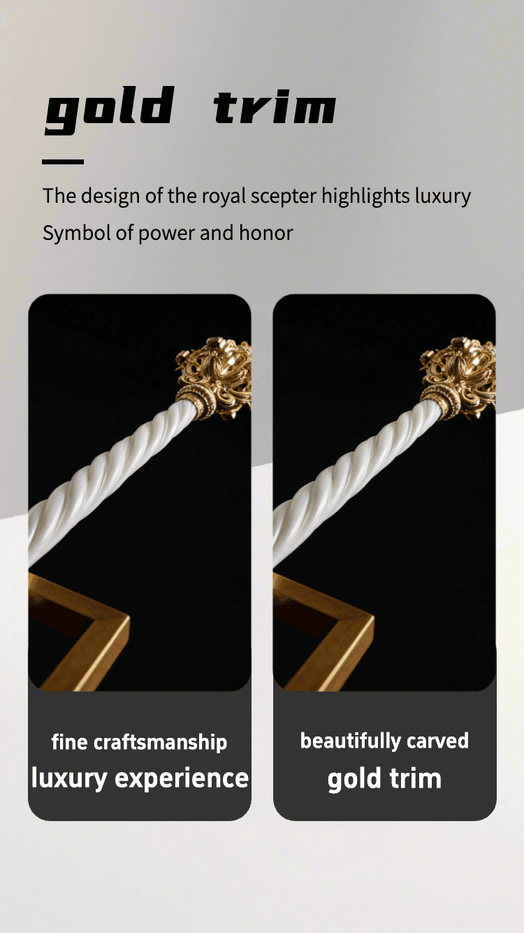 Elevate your space or special occasion with this exquisitely handcrafted ceremonial scepter. Meticulously made by skilled artisans, it features a lustrous gold-plated ornate top (adorned with delicate details and subtle gemstone accents), paired with a sleek, twisted white marble handle for a luxurious touch. The intricate design blends vintage royal charm with premium craftsmanship, making it perfect for decorative displays, royal-themed events, or as a distinctive statement piece in homes, galleries, or ceremonial settings. Durably constructed with high-quality materials, this scepter balances artistry and elegance— a timeless addition for collectors or anyone seeking a touch of regal sophistication.