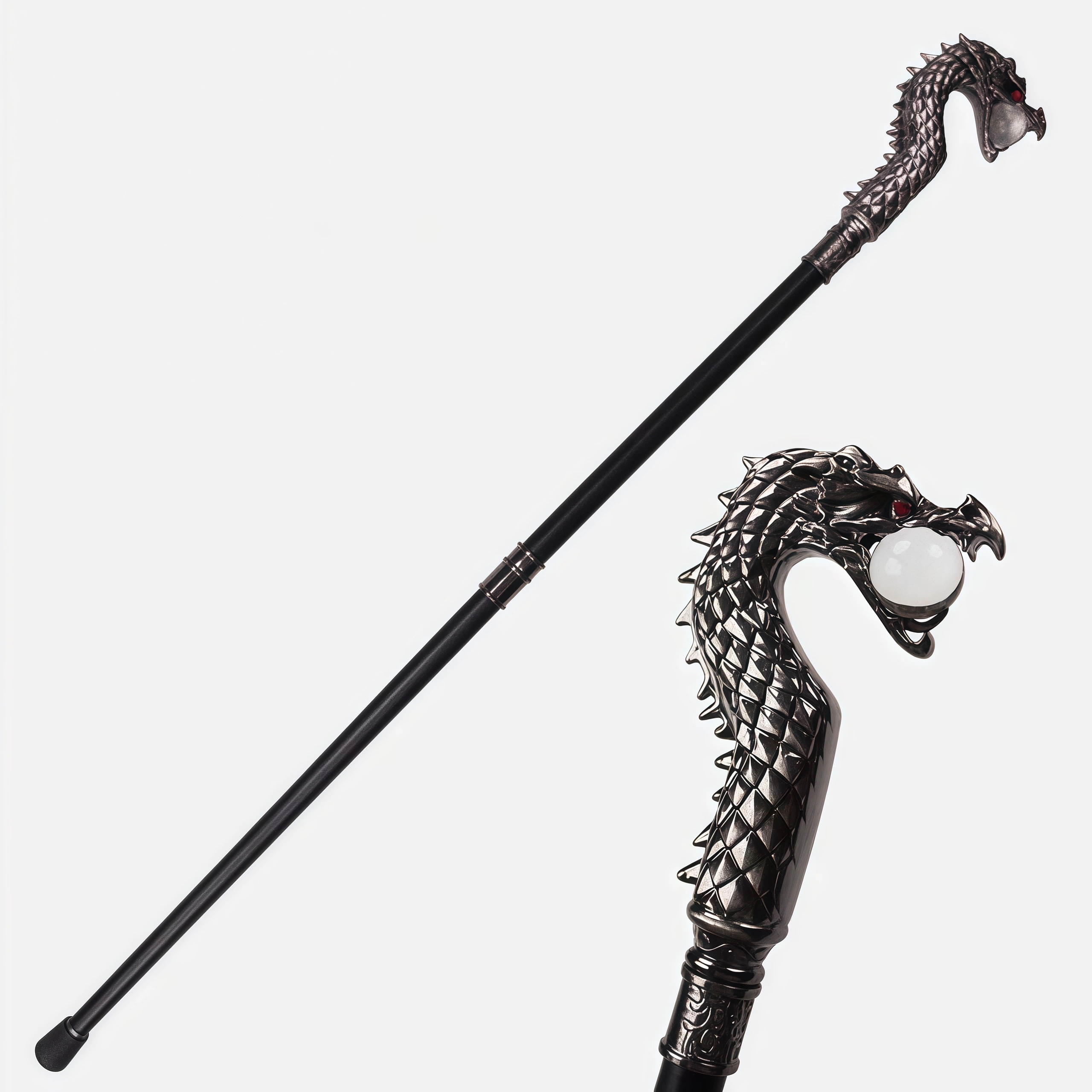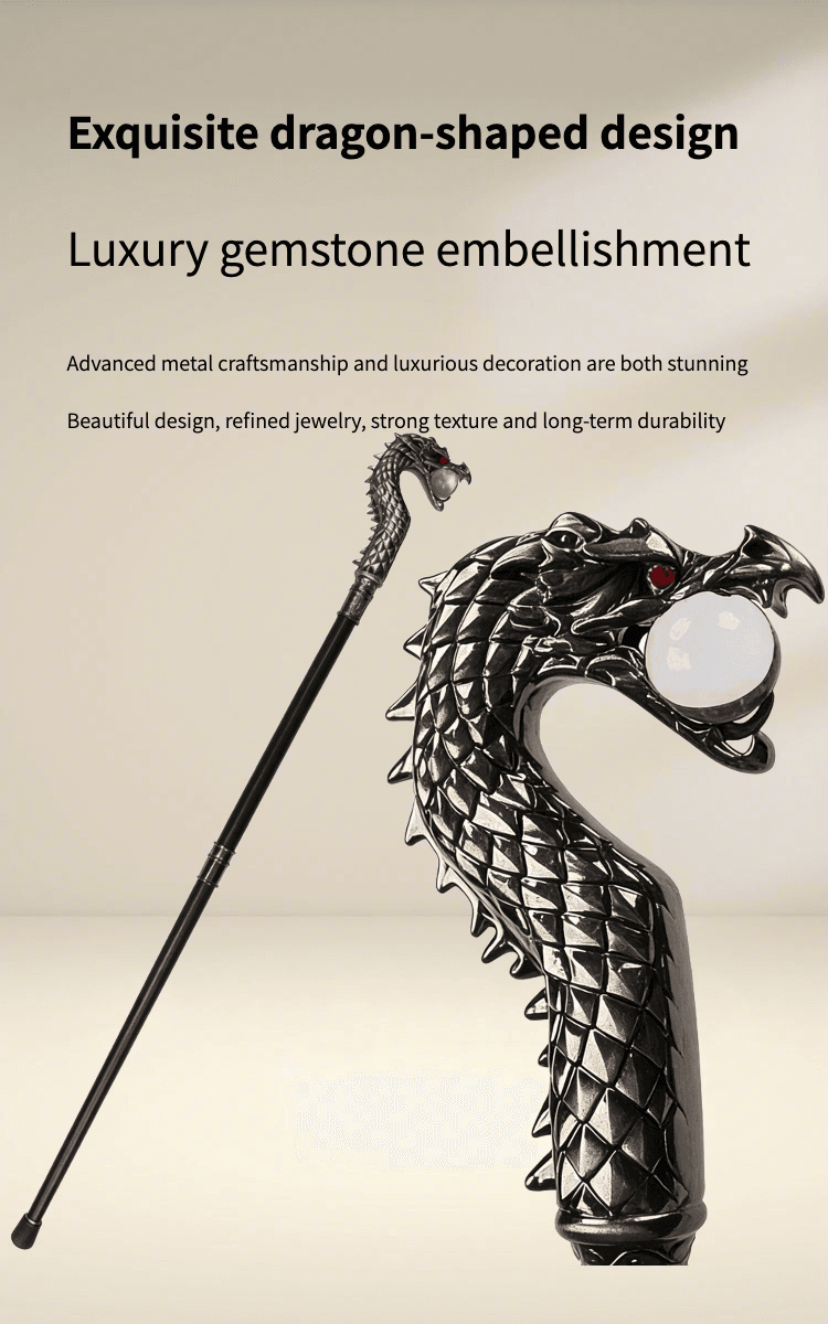 This intricately crafted dragon-head walking cane features a textured metal dragon sculpture with a glowing crystal ball, a sturdy black shaft, and a polished handle—perfect for cosplay, gothic decor, or as a unique collectible.