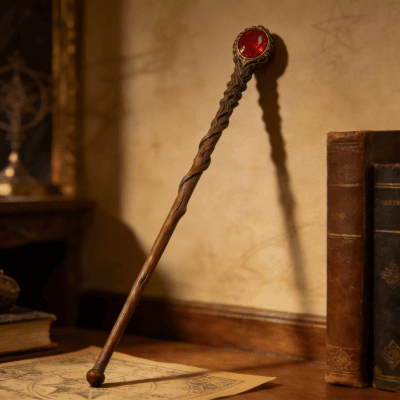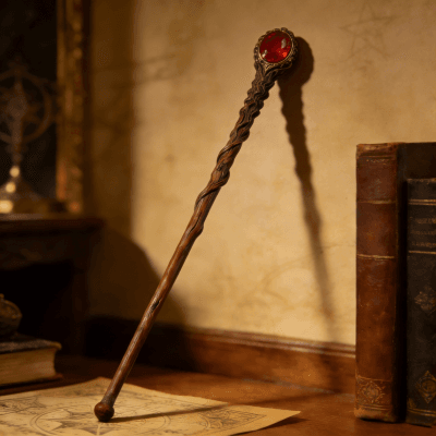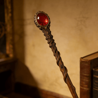 Handmade wooden wizard wand with red gemstone. Artisan-crafted for cosplay, fantasy role-play, and magic enthusiasts.